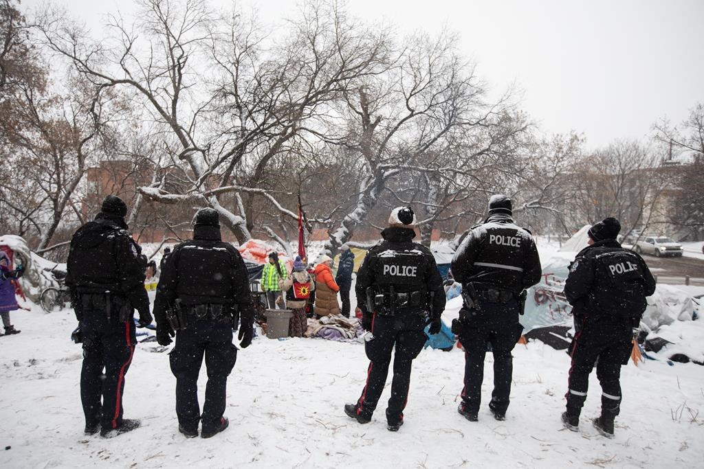 Le 10 janvier, Mme Morin menait des entrevues dans un campement de sans-abri à Edmonton lorsque la police municipale s'est présentée pour le démanteler, installant un cordon de ruban jaune autour du site pour exclure le public.