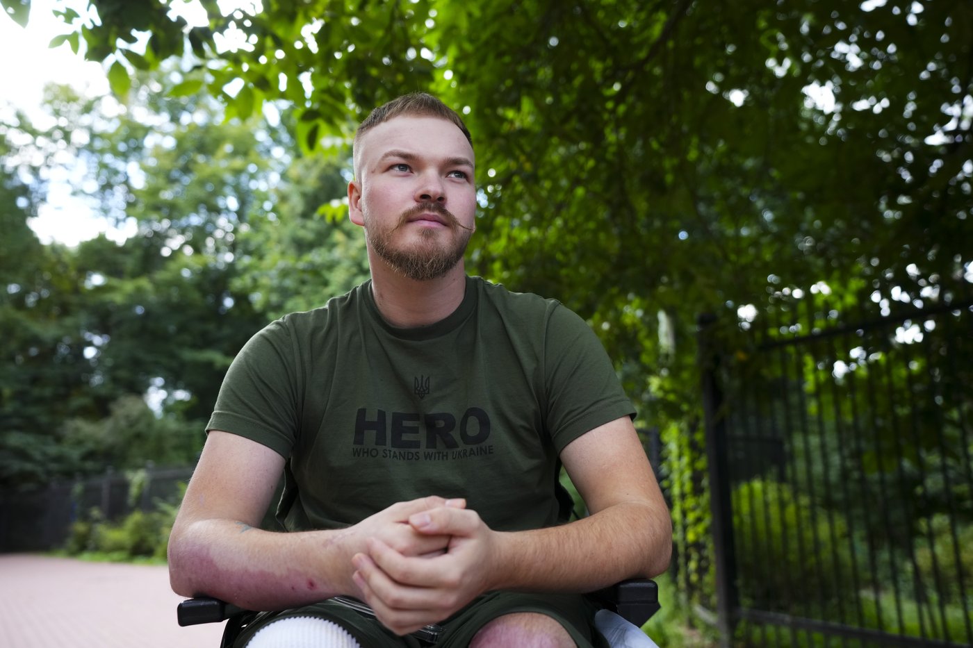 Assis dans un fauteuil roulant près de l'hôpital clinique de la ville de Kyiv où il reçoit des soins, Mac Hughes a raconté l'attaque qui a causé ses blessures.