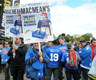 @Bas de vignette: La Une du magazine tournée en dérision lors de la Marche Bleue à Québec du 2 octobre dernier.