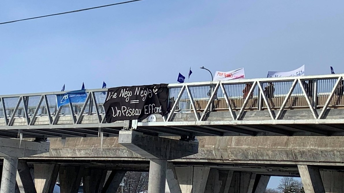 Déterminées à faire entendre leur indignation devant le mépris du gouvernement aux tables de négociation, des personnes membres de l’APTS ont manifesté hier lors d’une action surprise en déployant une bannière sur le pont piétonnier Brien, à Repentigny, où l’on pouvait lire « Négo négligée = réseau effondré ».