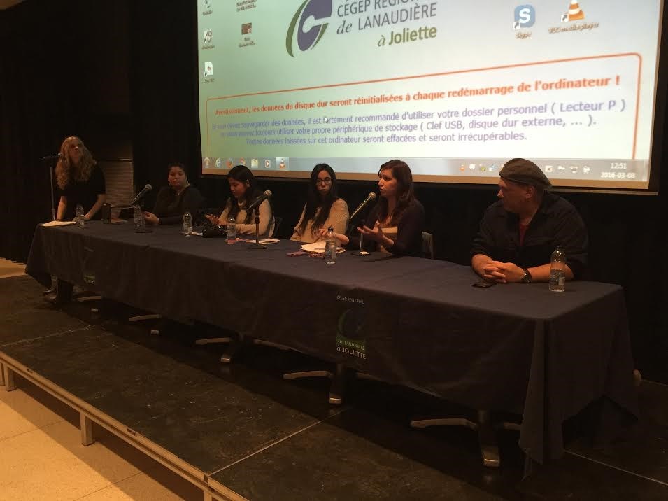 Organisé par le département de Sciences humaines, en collaboration avec le Centre d’amitié autochtone de Lanaudière et le Regroupement des étudiants et étudiantes du Cégep à Joliette, l’activité avait pour objectif de donner une tribune aux femmes autochtones et de mettre en lumière les réalisations de cette communauté. Les témoignages des différents invités, dont monsieur Marc-André Pauzé, photojournaliste spécialisé sur les réalités autochtones, et madame Widia Larivière, coordonnatrice jeunesse chez Femmes autochtones du Québec et co-fondatrice du mouvement Idle no more Québec, ont permis de mieux comprendre la réalité des communautés autochtones. La présence de trois jeunes femmes atikamekws de Manawan, madame Vicky Moar-Niquay, madame Jemmy Echaquan et madame Dannys Flamand, et le partage de leur parcours respectif a également permis aux participants de mieux cerner les enjeux touchant les jeunes femmes autochtones dans Lanaudière.