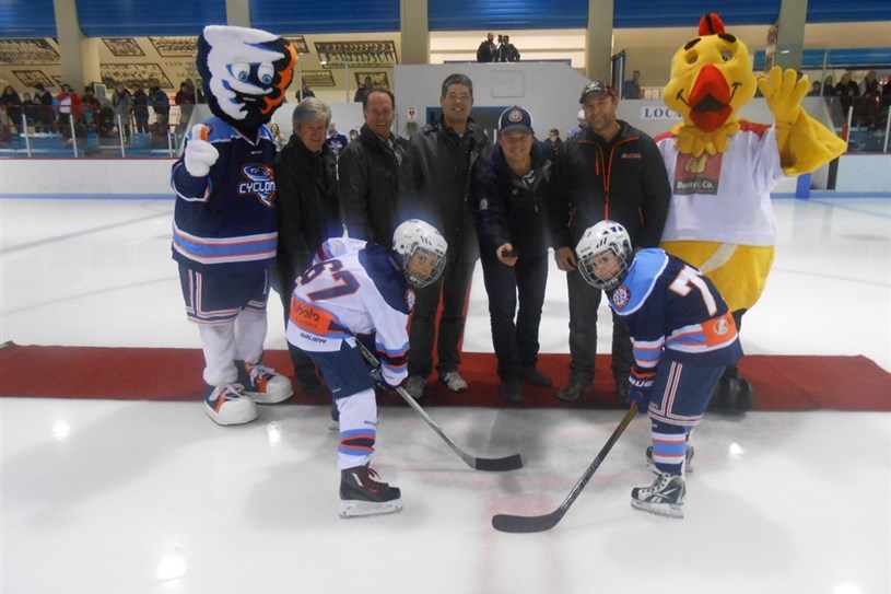 La mise au jeu protocolaire du tournoi A. Laporte et fils Kubota de Joliette-Crabtree a été effectuée par plusieurs dignitaire. De gauche à droite, la mascotte Bourrasque, Luc Beauséjour (conseiller municipal à Joliette), Gilbert Perreault (Fédération des Producteurs de lait du Québec), Michel Rousselle (propriétaire de six bannières Tim-Hortons dans le grand Joliette et président d'honneur). Martin Lortie (président de l'AHMJC), Marcel Baker (A. Laporte et fils Kubota) et la mascotte Benny.