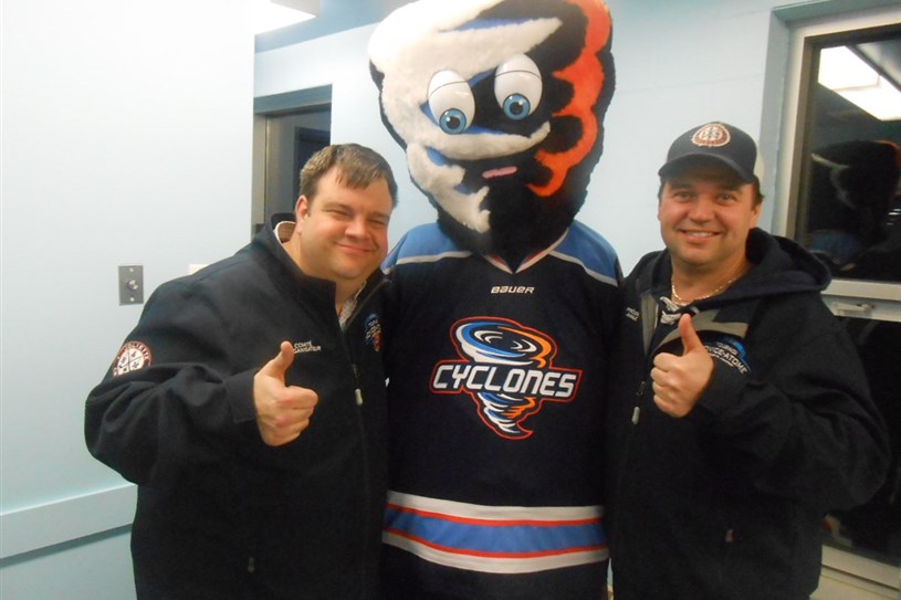 François Cardin (coordonnateur du Tournoi) et Martin Lortie (président AHMJC) en compagnie de la nouvelle mascotte de l'Association, Bourrasque.